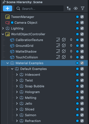 Under the WorldObjectController > Examples > Default Examples in the Scene Hierarchy panel, we have 9 different materials.