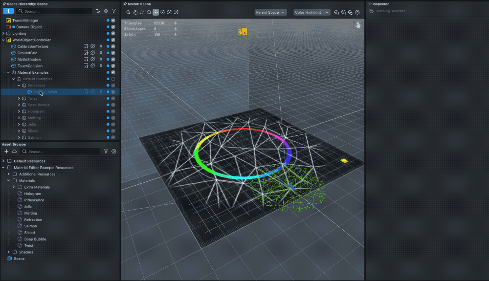 The Material Editor sample project includes a number of materials made with the Material Editor that can be easily exported and imported into other projects. The materials used in this project can also be found in the Material Section in the Asset Browser panel. Each material can be modified through the Material Editor, or the Inspector panel.