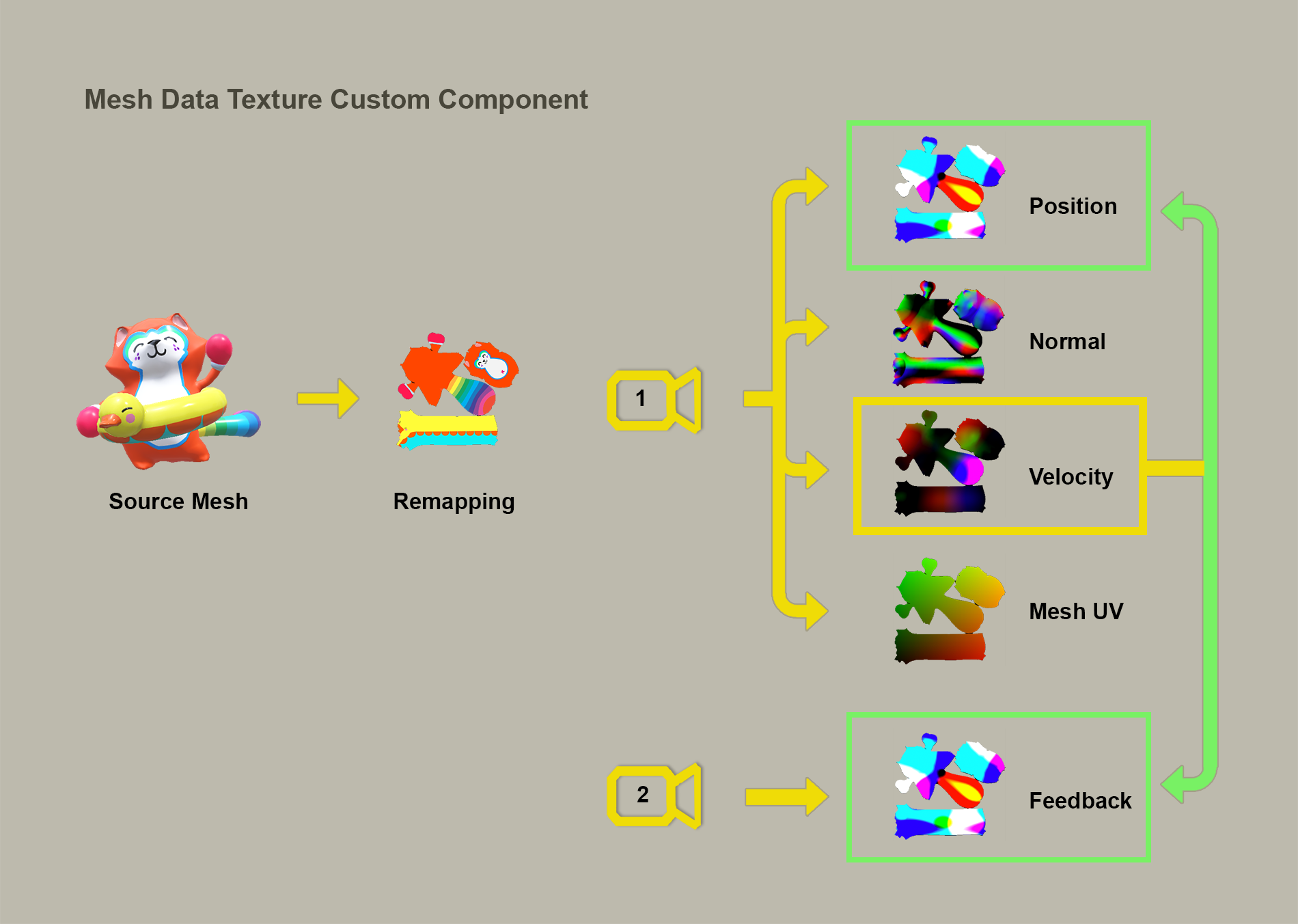 Mesh Data Texture custom component captures mesh information and encodes it into texture atlases for use in materials or VFX. It processes attributes like position, normal, velocity, and UVs using multiple render targets. The system runs in two camera passes: the first pass writes mesh data into the atlases, while the second stores position data from the current frame to calculate velocity. These textures are then sent to the materials or VFX, enabling dynamic effects that can react to the mesh’s shape and movement in real time.