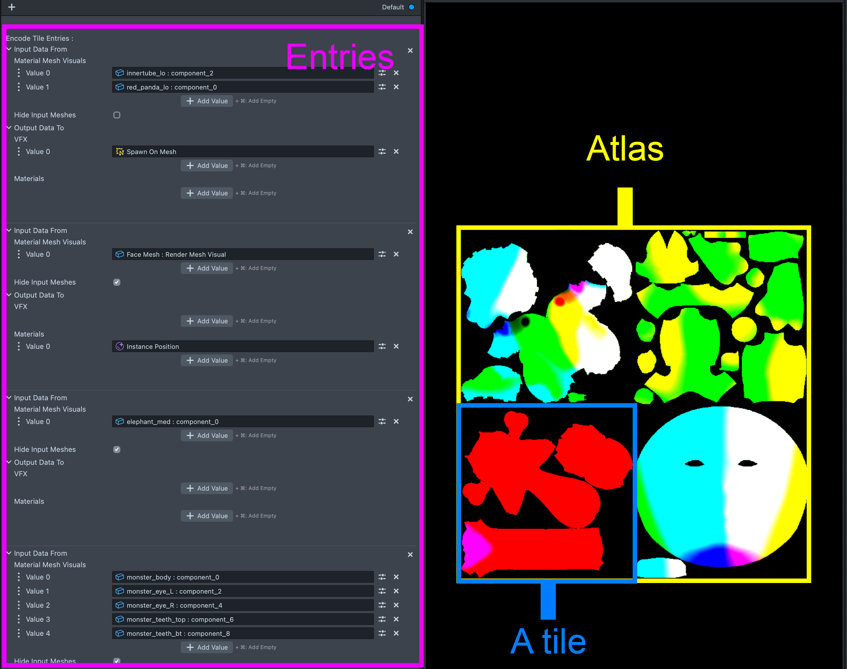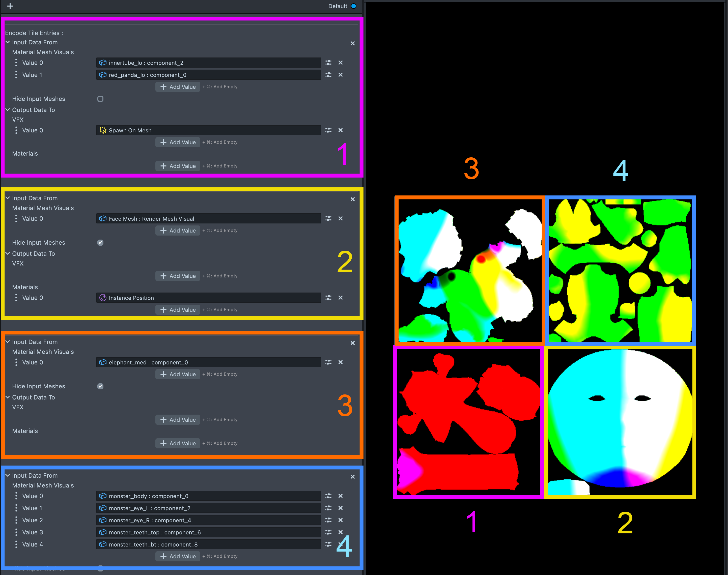 All materials and VFX assigned to a given entry automatically sample data from that entry’s tile, so no additional configuration is needed. Those data can be sampled in VFX, materials, or both, using a Sample Mesh Data Texture node. Check out the Mesh Data Texture Example pack in Asset Library for examples.