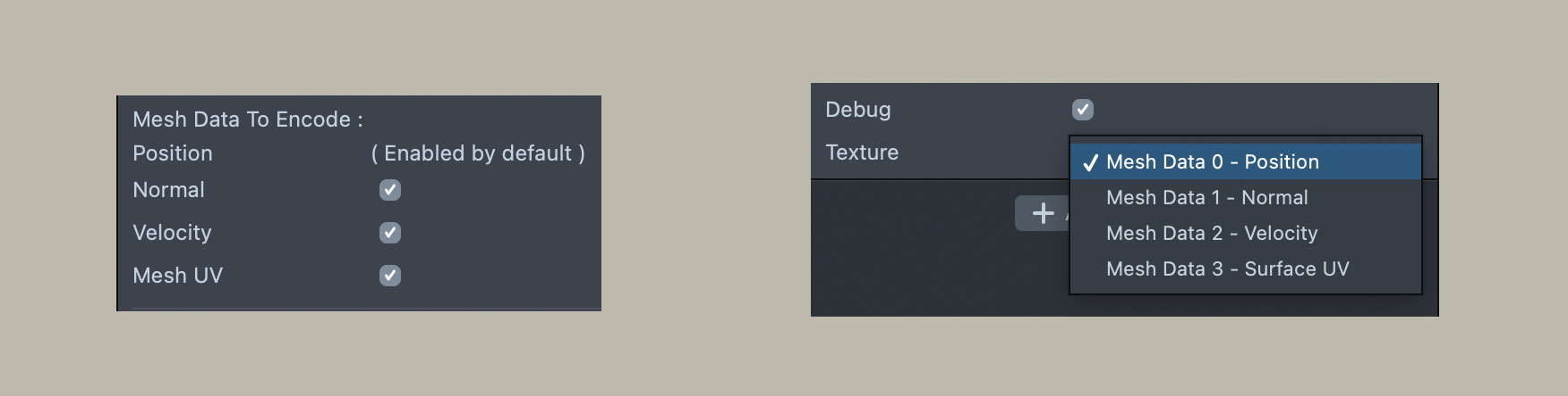 | Mesh Data To Encode | Position | Mesh position attribute is written to the atlas by default. | ||
