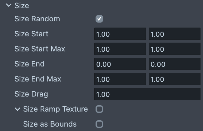 Size End,Size End Max]. - Size Drag (float): The power of the Size applied to the particles, which can be used to ramp up the scale of particles at birth.