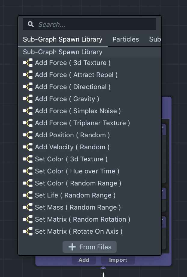 To create a Container Sub-Graph in a VFX Editor container, you can either click on the Add button or hit tab on your keyboard while pointing your cursor at a desired container. A sub-graph will only show up within its corresponding container (Spawn, Update or Output Quad). After the list appears, you can begin typing to filter subgraphs by name.
