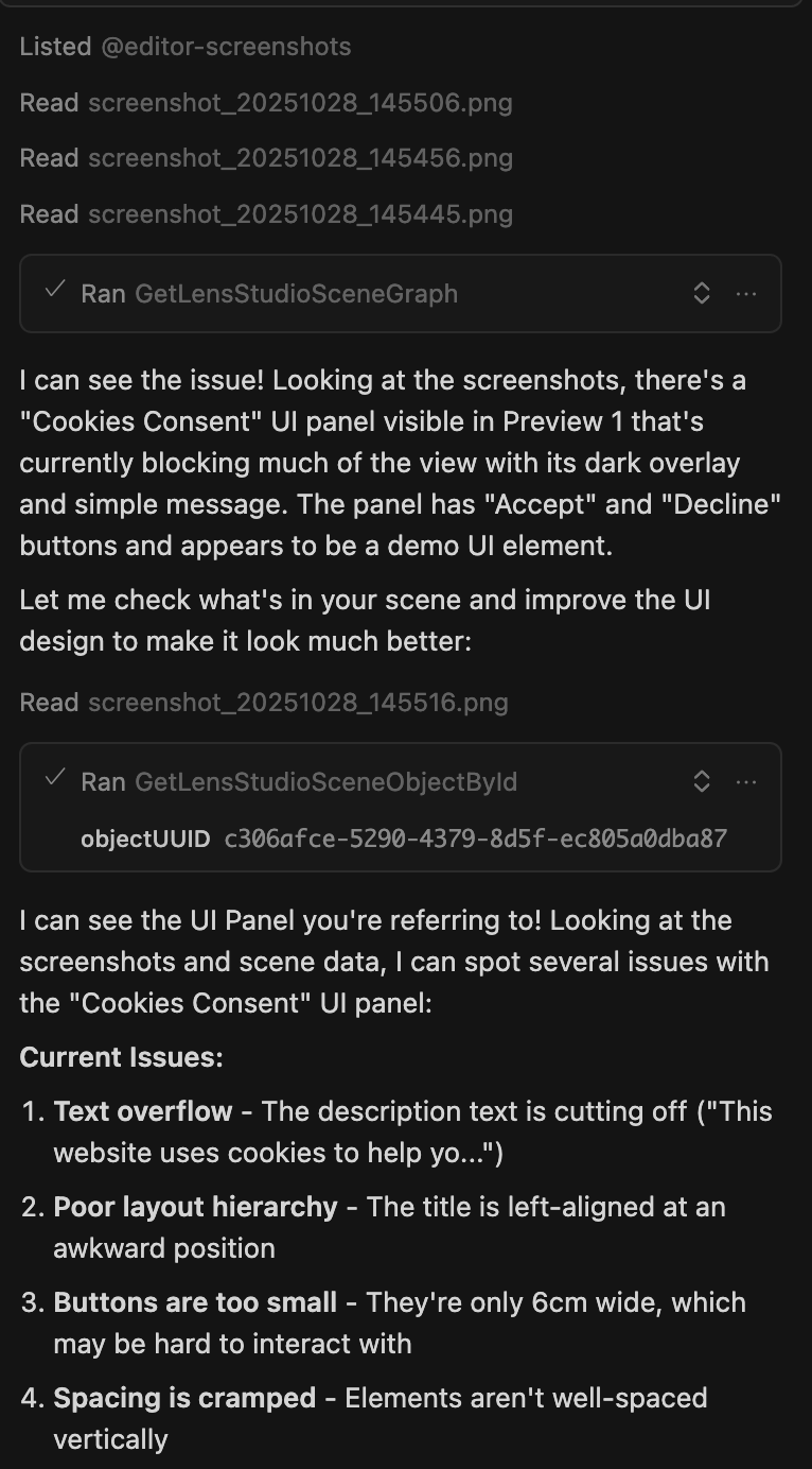 Here's an example of Cursor using the Lens Studio MCP tools. Notice how the AI assistant calls various tools like GetLensStudioSceneGraph and SetLensStudioProperty to interact with your Lens Studio project: