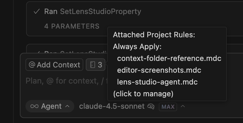 You can use the Example Prompt as a starting point for your Cursor Rules. This prompt includes comprehensive guidelines for working with Lens Studio's TypeScript API and MCP tools.
