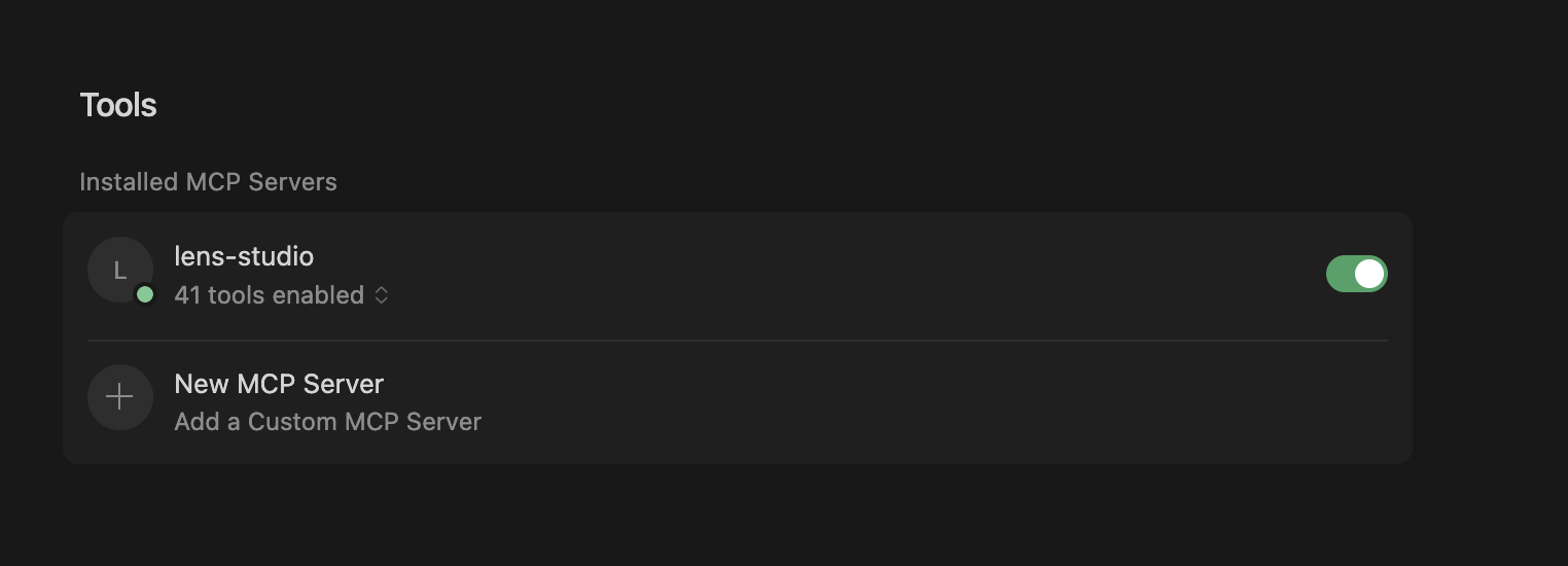 Go back to Tools and MCP in Cursor. Your Lens Studio MCP server will now be available and ready to be enabled.