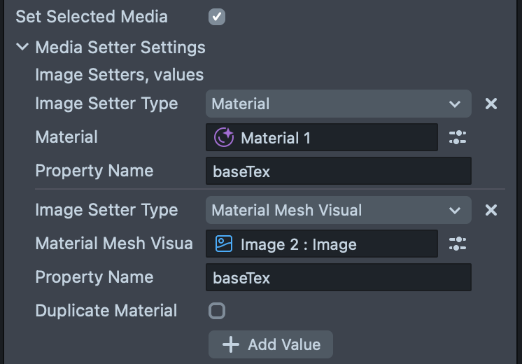 | Image Setter Type | enum | Type of object to display media on: Material, MaterialMeshVisual, VFXAsset, or VFXComponent. |