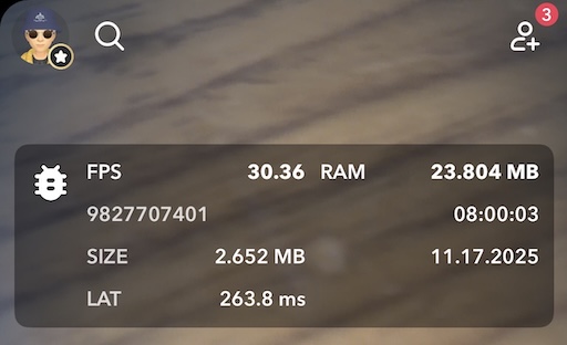 Bugbutton, you should now see performance stats for your Lenses.FPSrepresents your Lenses' framerates.RAMrepresents how much memory your Lenses are consuming.SIZErepresents how large your Lenses are.LATrepresents the Lens Activation Time.- a time stamp displays when the Lenses were last pushed.