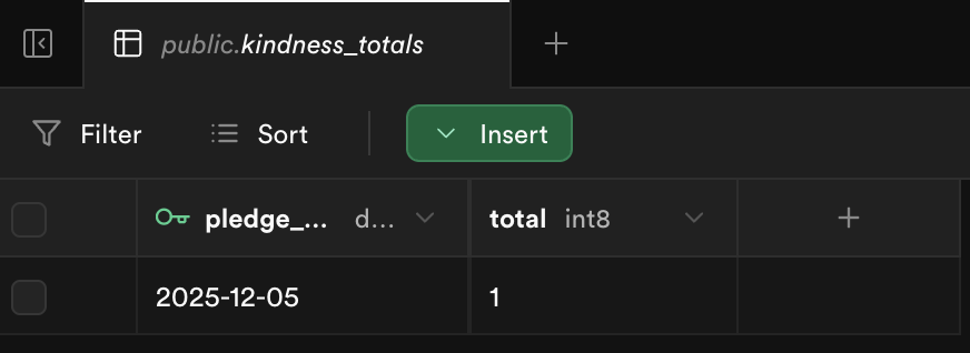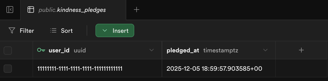 Before running the web app or opening the Lens, it’s helpful to insert sample pledge data so you can verify that your setup is working correctly.