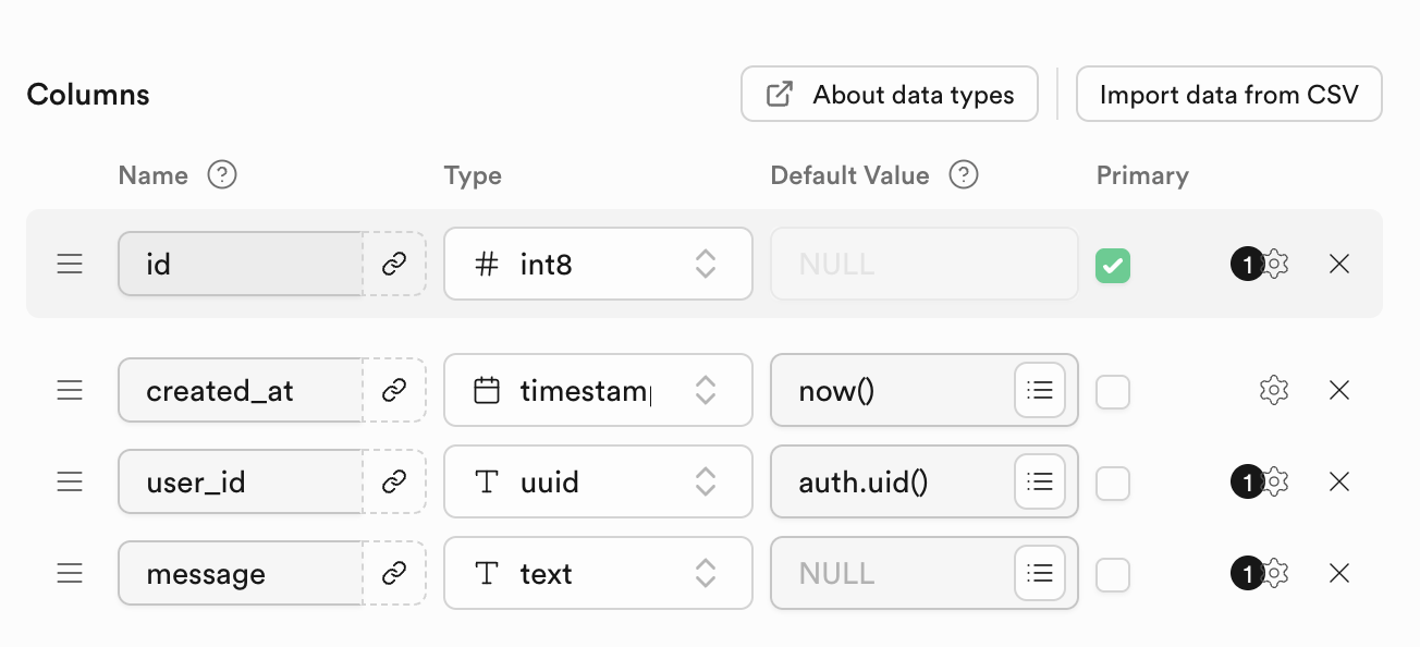 For our example table, add two additional columns using the Add Column button. First, add a column named user_id; set its type to uuid, and its default value to auth.uid. Next, add a column named message, and make it of type text. Your final configuration should look like the image below. Save the table.