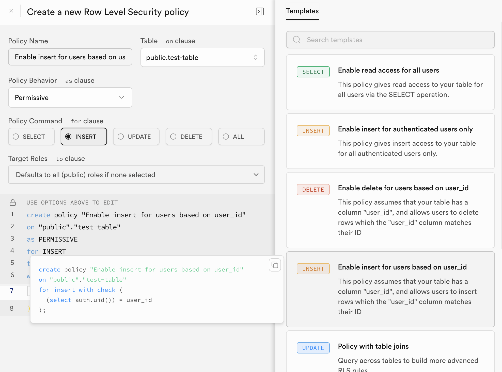 Now that we have a table, we have to configure its access policies. In this example, let's setup our table so users can only insert data tied to their own user_id, and can only view data associated with their own user_id. To do this, go to your table in the Table Editor and click Add RLS policy, then click Create Policy. From the templates on the right, select Enable insert for users based on user_id, then click Save Policy.