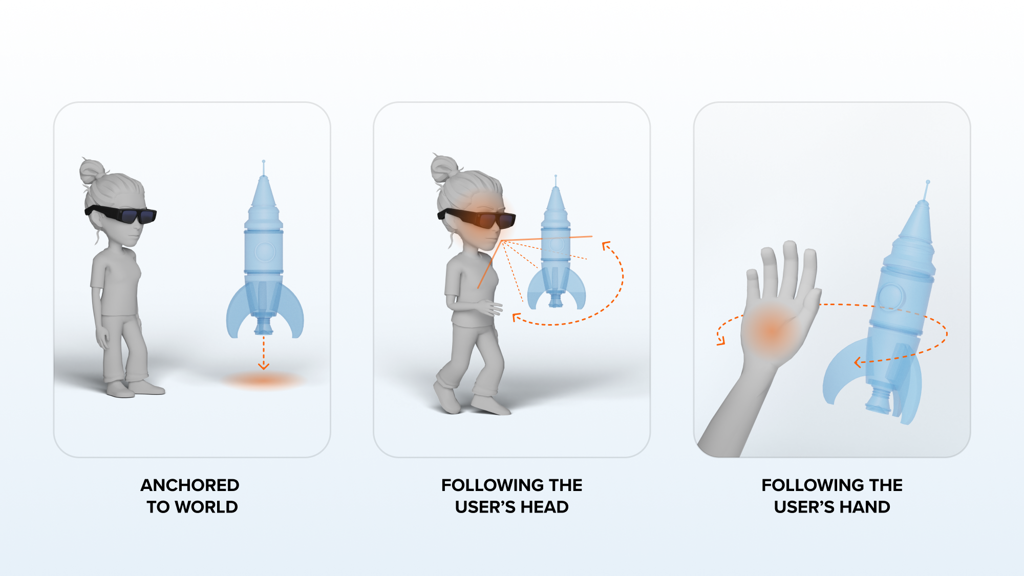 Different postures may require different types of anchor dynamics. Anchor dynamics describe the logic of how content is positioned in a scene. Content can be anchored in the real world with a fixed position, follow the user's head or hand as relative anchors, or dynamically follow a real-world object using Object Trackers.