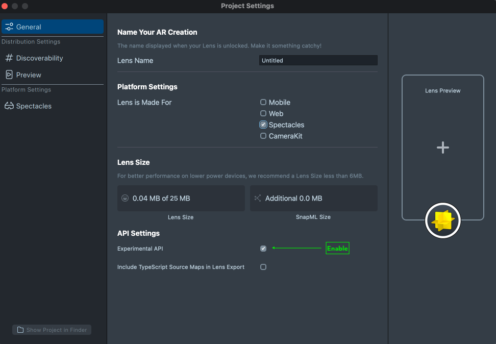 Experimental APIs provide access to features and capabilities of Spectacles that are under development. These APIs may be modified or deprecated without notice and do not guarantee backward compatibility in future releases. When your Lens project uses experimental mode, you cannot publish the Lens to a wider audience, and it remains self-contained to your Lens project and device.