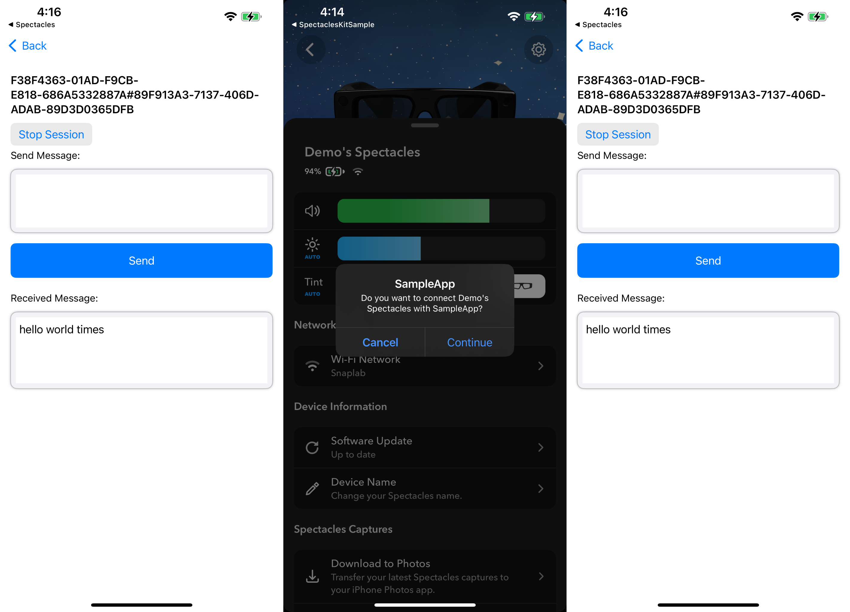 4. In the Spectacles app, wait for device connection, and tap Continue to return back to the sample app.
