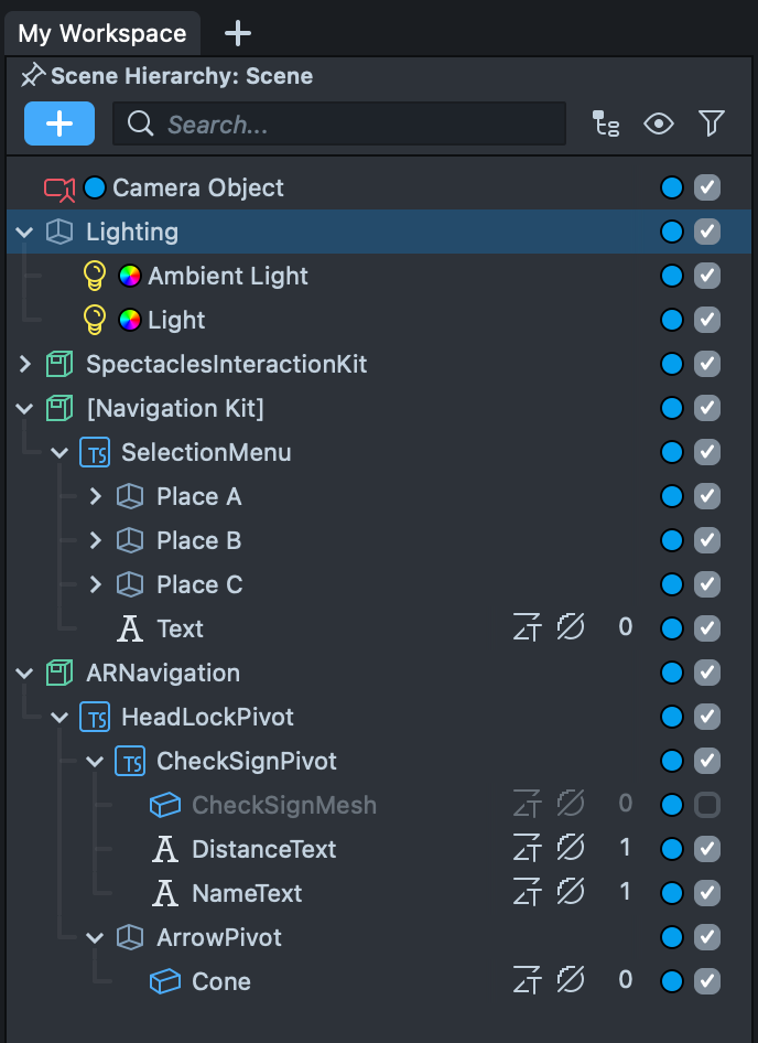 ARNavigationPrefab [PUT_IN_SCENE]prefab to your Scene will add a 3D arrow that will point to the currently selectedPlace. You will find this in theARNavigationComponentfolder.