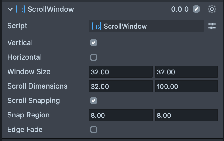 Scroll Snapping | Enables ScrollWindow's scroll snapping behavior. If snapping is enabled it will add "sticking points" that the ScrollWindow will automatically scroll and stop on when an interaction ends. |