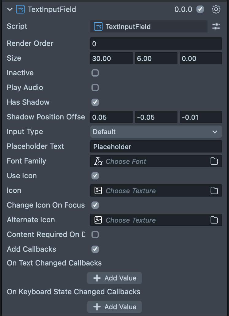 Change Icon On Focus | (only visible when Use Icon is selected) Turns on a behavior that swaps the icon when the TextInputField is selected. |
