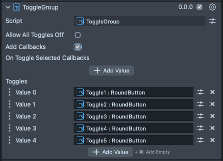 Toggles | The in panel interface for attaching Toggles to this group. Toggles added here are managed by this Toggle Group element. |
