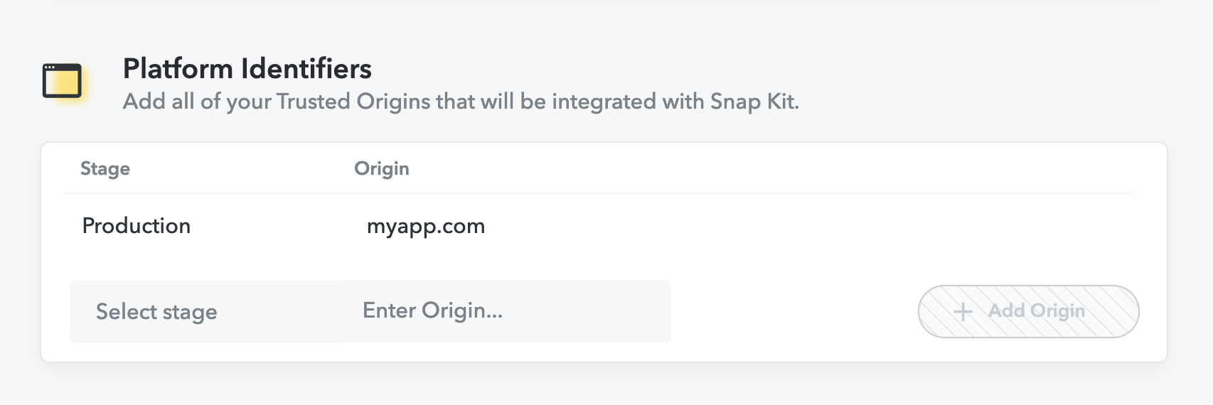 Make sure to specify your Trusted Origins in the Platform Identifiers section of your Snap Kit application configuration. This step is crucial to authorize API usage on the designated web pages where you plan to deploy your application.