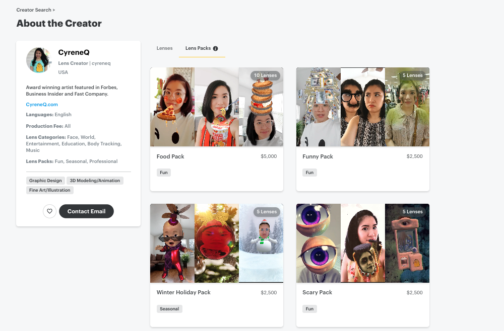 Pre-built, categorized groups of Lenses created by top Snap Lens Network partners available for purchase within the Creator Marketplace. Lens Packs are designed to accelerate your time to market with AR by enabling you to easily purchase high quality Lenses from a range of categories including beauty, professional, utility, and games.