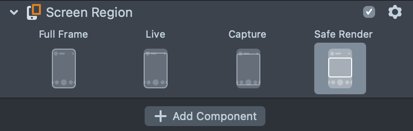 Full Frame Screen Region: If designing screen-space content that can exist behind the app UI, it is recommended to use the Live or Capture regions of the Screen Region Component. In Camera Kit, the Full Frame is the uncropped camera frame, meaning that the bounds of the Full Frame region may extend beyond the screen itself. If you notice that your content is shifted offscreen when testing in the Camera Kit app as compared to Snapchat, ensure that you are binding content to the Live or Capture regions and not the Full Frame region.