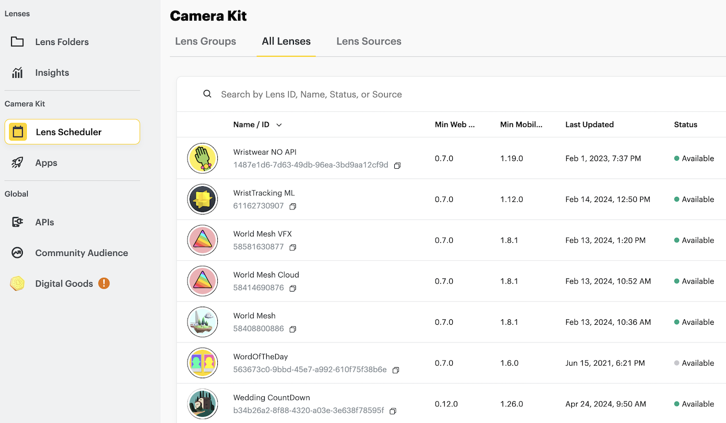 The ‘All Lenses’ view includes all of the Lenses you can use to deliver to your Camera Kit application. For each Lens listed, there is an overview of the Lens name, its unique ID, last update, and associated Lens source.