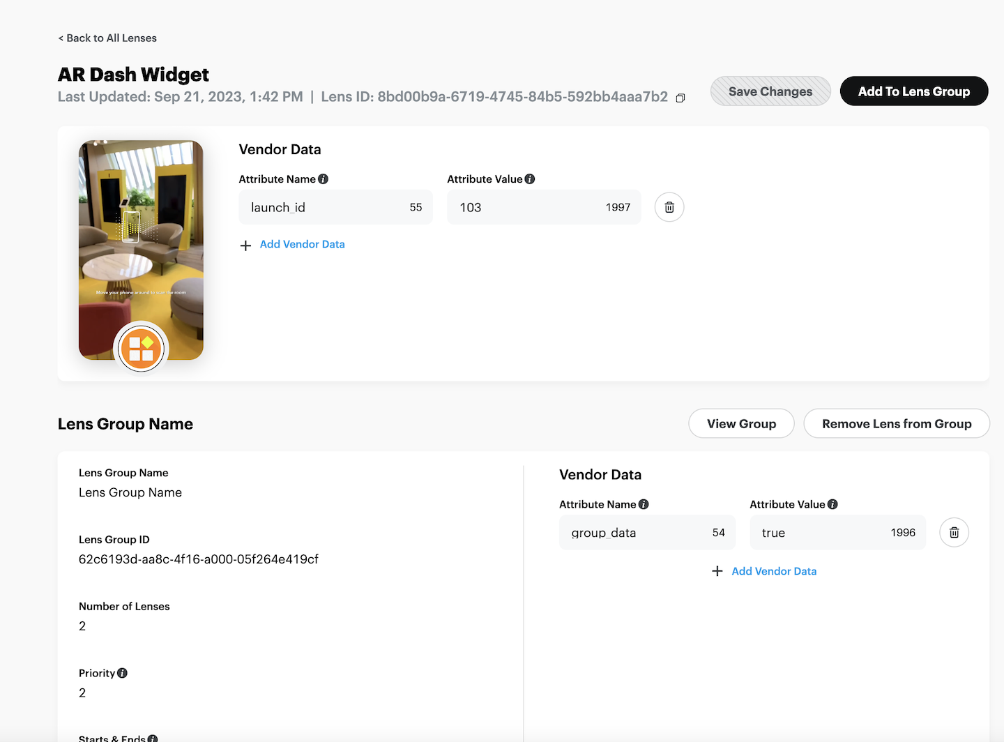 Additionally when added to a Lens Group you can specify vendor data unique to that group. The vendor data will only be attached to the Lens object when requested from that group.