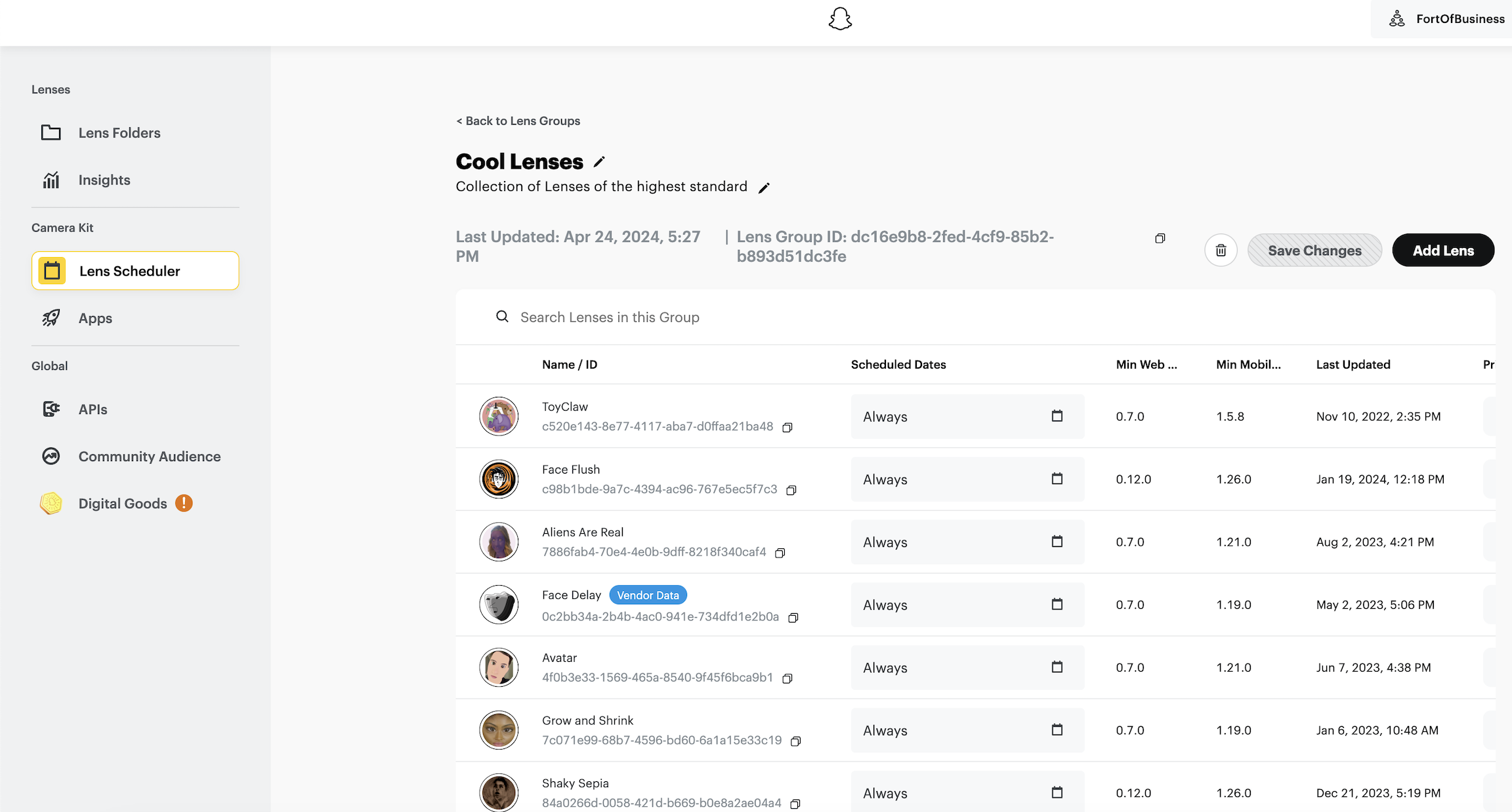 From here you can edit the group name, copy the Lens Group ID for use in your app, add or remove Lenses, and also the sort order of Lenses within the group.