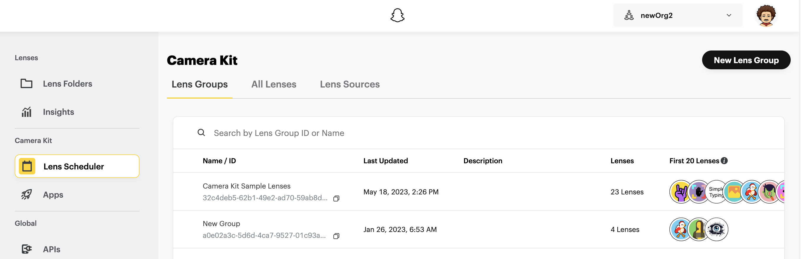 Lens Groups are collections of Lenses that could be thought of as a logical representation of a Lens Carousel UI element within a Camera Kit application. A Lens can belong to as many groups as you choose and you can create as many groups as you'd like.