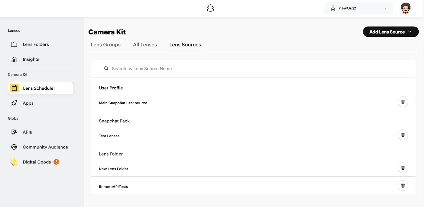 You may also remove any number of Lens Sources at any time by clicking on the trash icon for each respective source when you are in the Lens Sources tab.