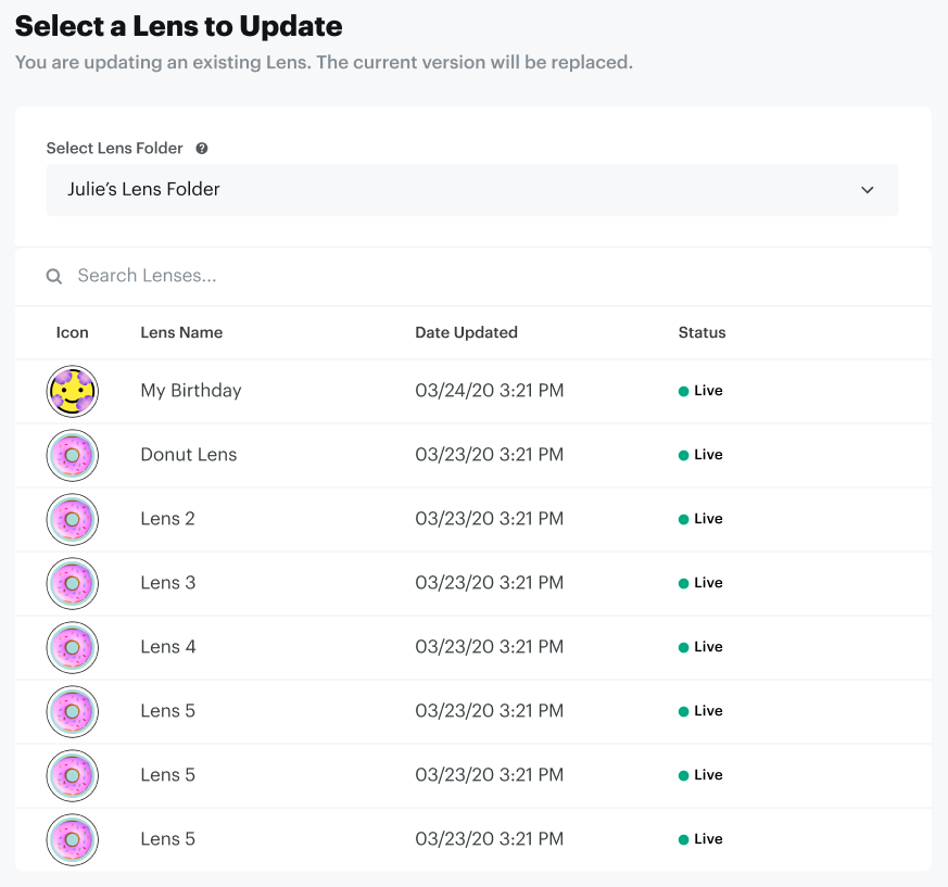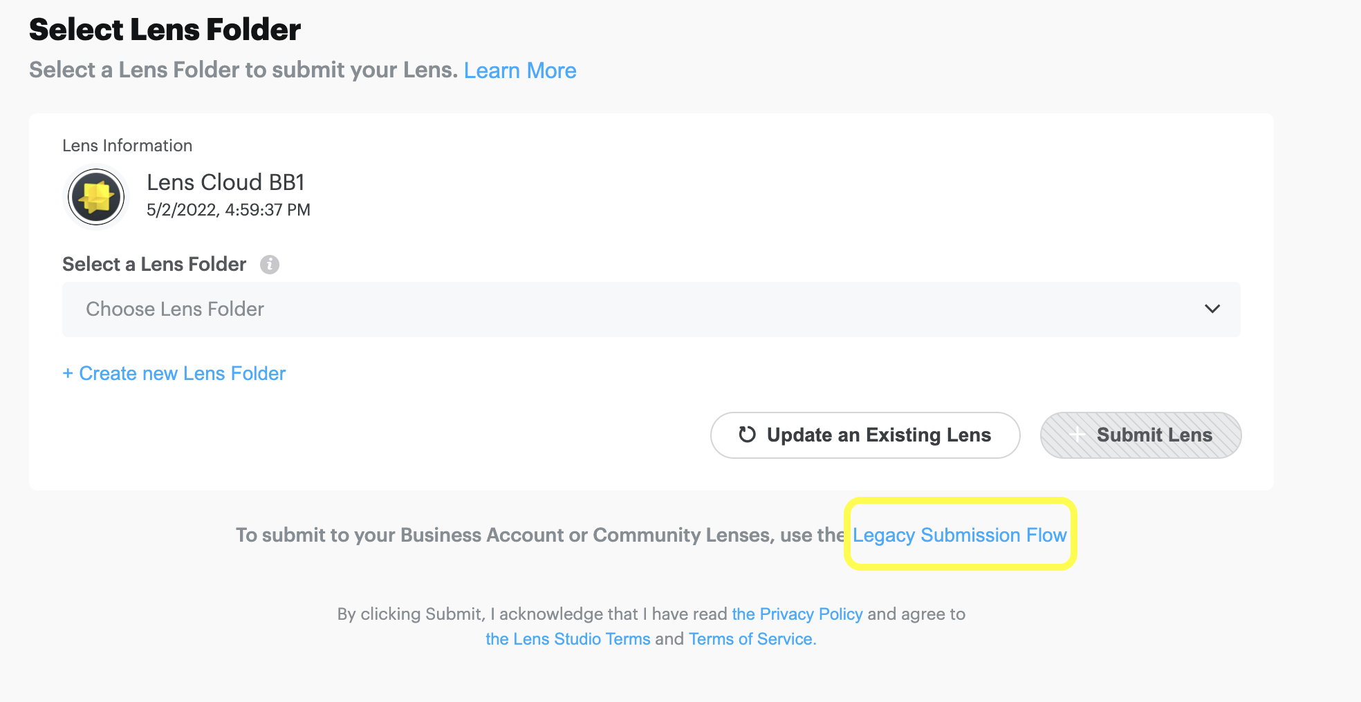 Lenses submitted prior to the rollout of Lens Folders can still be found within the My Community Lenses or Business account sections. To move these Lenses to a Lens Folder, they will need to be re-published directly to the Lens Folder from Lens Studio. Otherwise, they can be accessed via the Legacy Submission Flow when submitting a Lens