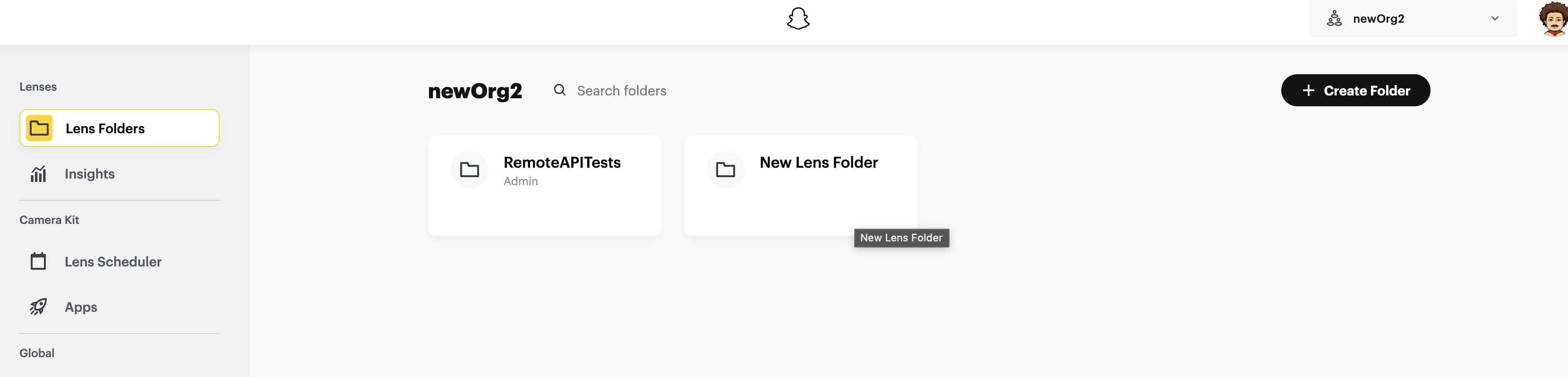 - Choose your Organization to create the new Lens Folder.