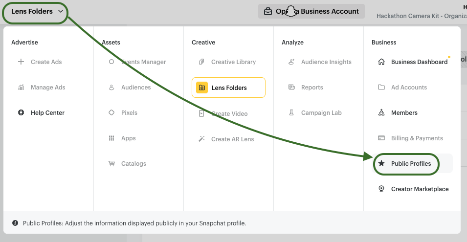 Lenses can be submitted to your company’s Public Profile for easy use and visibility in both Snapchat and Camera Kit. Steps for setting up a Public Profile for your business can be found here and the following steps show how to upload a Lens to a Public Profile and Camera Kit integration: