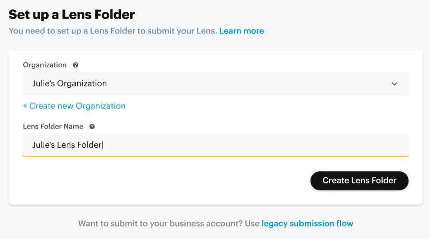 While the recommended path for submitting Lenses is to upload them to a Lens Folder, some users and businesses may prefer to follow the legacy submission flows which are outlined below. The legacy submission flow can be selected during the publishing process within the My Lenses Portal: