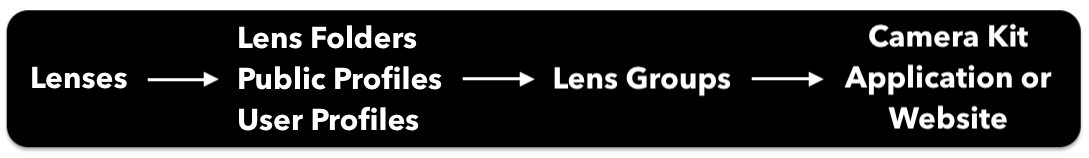 Lenses are AR experiences built in Lens Studio or Lens Web Builder. When a Lens is uploaded, it can be submitted to a user's individual profile or a Lens Folder. Lens Folders are containers of Lenses which are owned by the Organization. Uploading Lenses to a Lens Folder is the recommended approach when creating content for your integration. Lens Folders, in addition to Public and User Profiles can be added as a source for your Camera Kit integration, meaning the Lenses uploaded to them will become available to be included in your app or website. Once these Lenses have been made available, they can be added to Lens Groups. Lens Groups are collections of Lenses within Lens Scheduler which are ready for delivery to your application or website. When you are pulling in Lenses into your application, you are directly referencing a Lens group.
