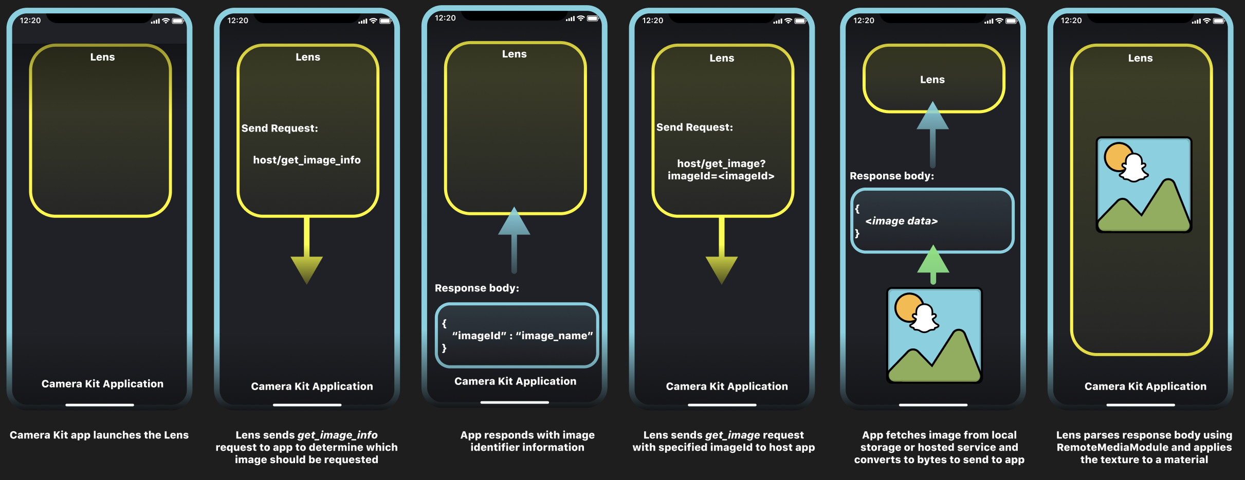 Remote APIs for Camera Kit require all communication to be sent from the Lens with the host application responding to these requests. Additionally, for media assets such as GLB models and images, you can leverage existing APIs within Lens Studio for converting these to Lens assets by sending them as individual responses. That is, importing 10 images would require 10 separate requests. The following image provides an overview of the communication between the Lens and host application that will be covered in this tutorial: