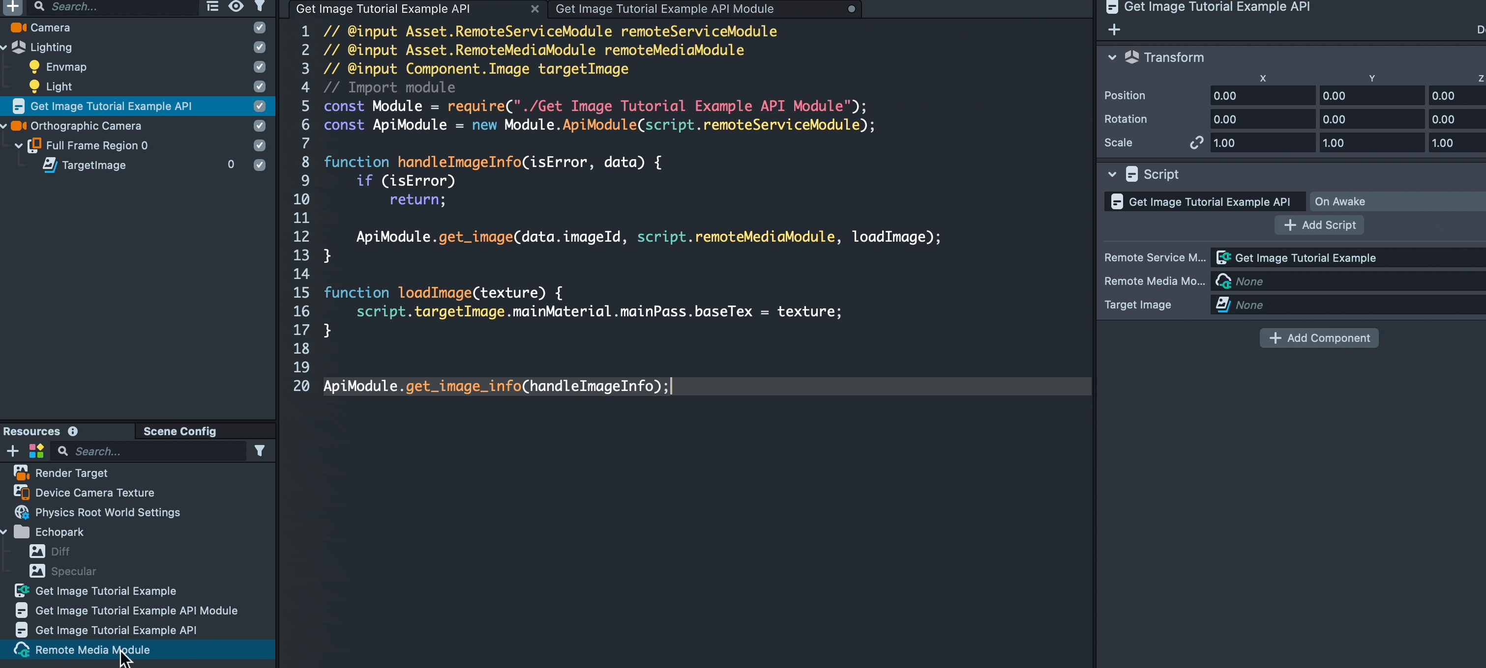 Next, open the Get Image Tutorial Example API file and you will see it is already configured to use the remoteServiceModule. Let’s add a few inputs for the script so we can add functionality to the Lens: