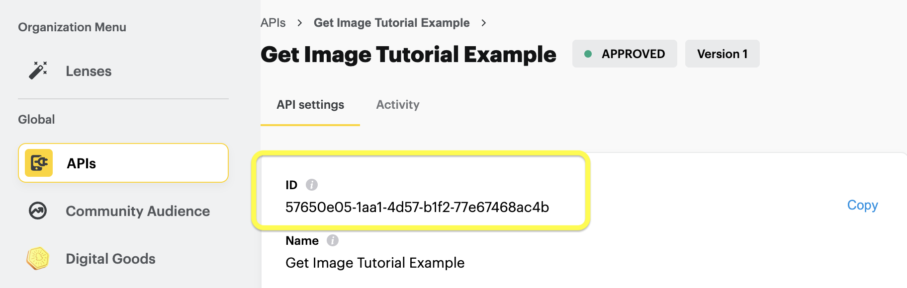 Make note of the API Key that is generated here as you will need to use this in your app to communicate with the Lens