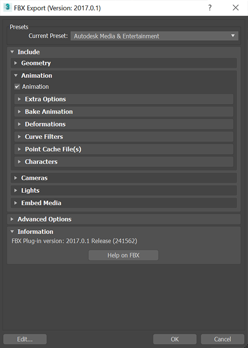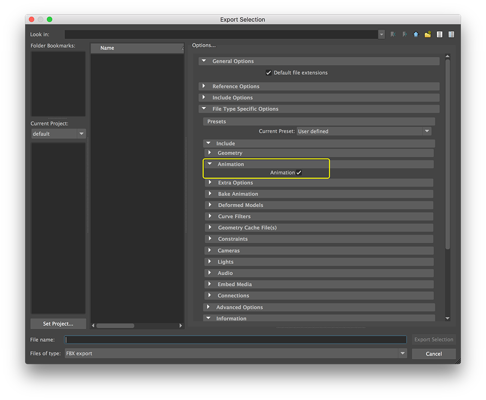 In the Export Selections option window, expand Animation options. Then check the Animation checkbox.