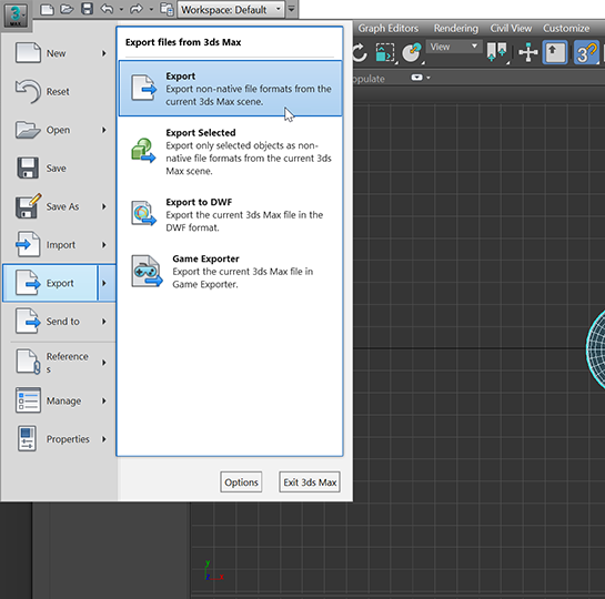 We are now ready to export the Vertex Animation. Click on the 3ds Max icon in the top left corner and then select Export.
