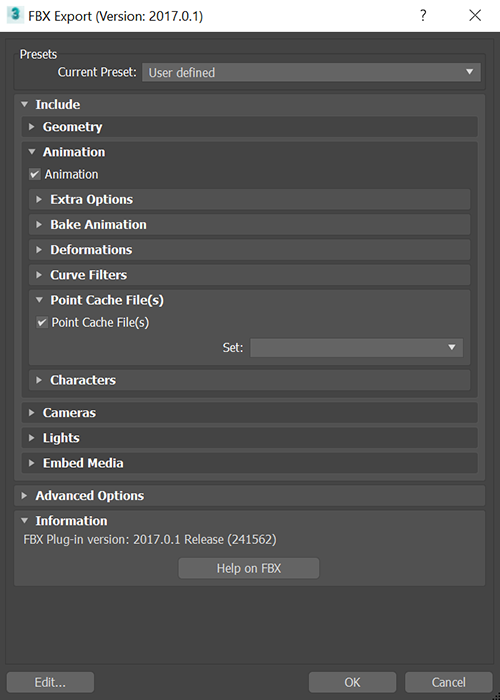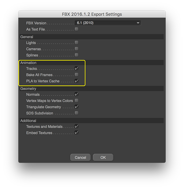 This will open the FBX Export Settings window. In the FBX Export Settings, inside the Animation section, make sure Tracks and PLA to Vertex Cache are checked.