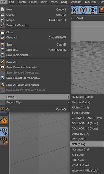 To export your own 3D object PLA animation we need to make sure that the animation is cached as keyframes and is not using Cinema 4D's deformers or effects. Next, select the File -> Export… -> FBX (*.fbx) from Cinema 4D’s menu bar. Select where you want to save your FBX and click Save.