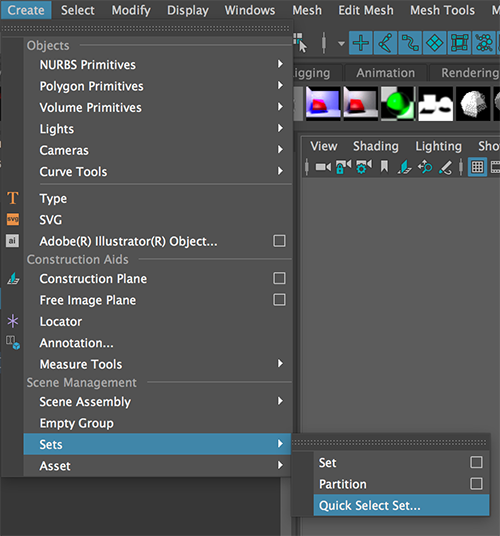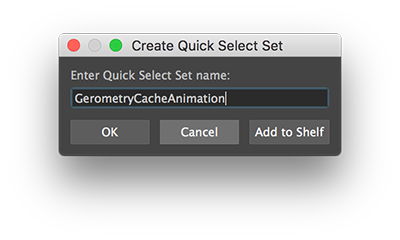 To export from Maya, first we need to define a set of objects that we want to export as vertex animation. In order to create a set in Maya, select the objects that have a geometry cache, then select Create -> Sets -> Quick Select Set… from Maya’s menu bar.