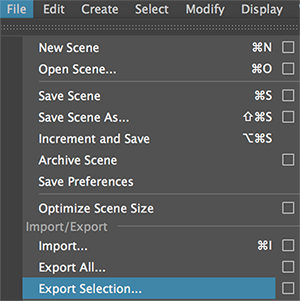 Now we are ready to export the Vertex Animation. Select the object(s) you wish to export in Maya’s Outliner window. Then, Select the File -> Export Selection... from Maya’s menu bar.