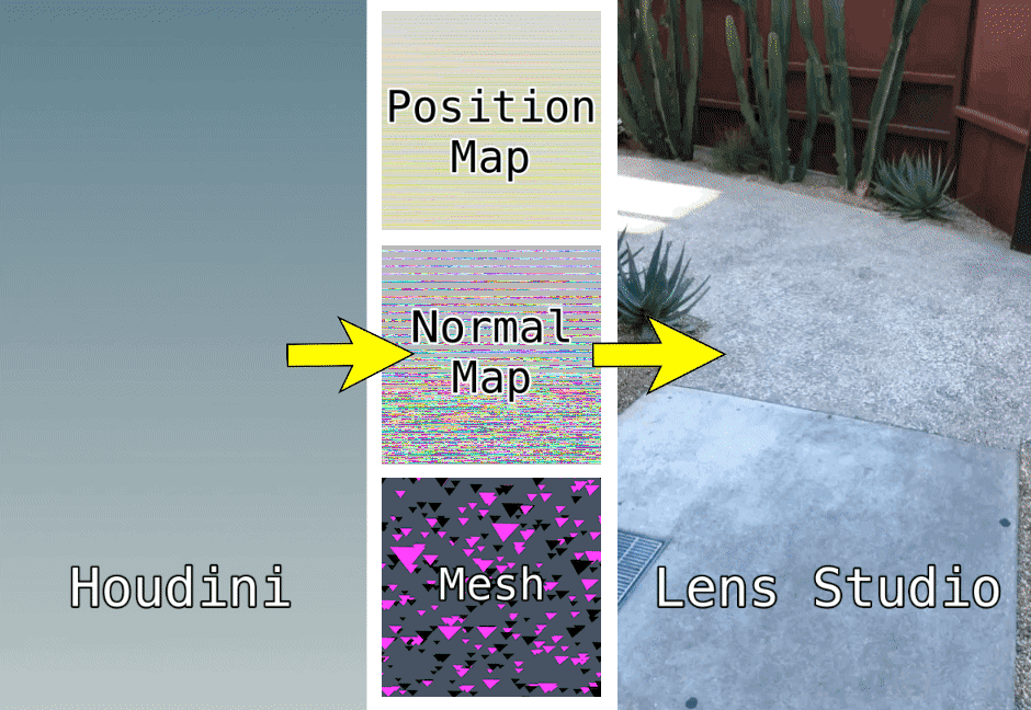 First, Houdini processes the simulation and stores it as a mesh and series of textures. Each pixel contains data about the position, rotation, or normals of a vertex during a specific frame in the animation. The types of data stored depend on the type of animation rendered.
