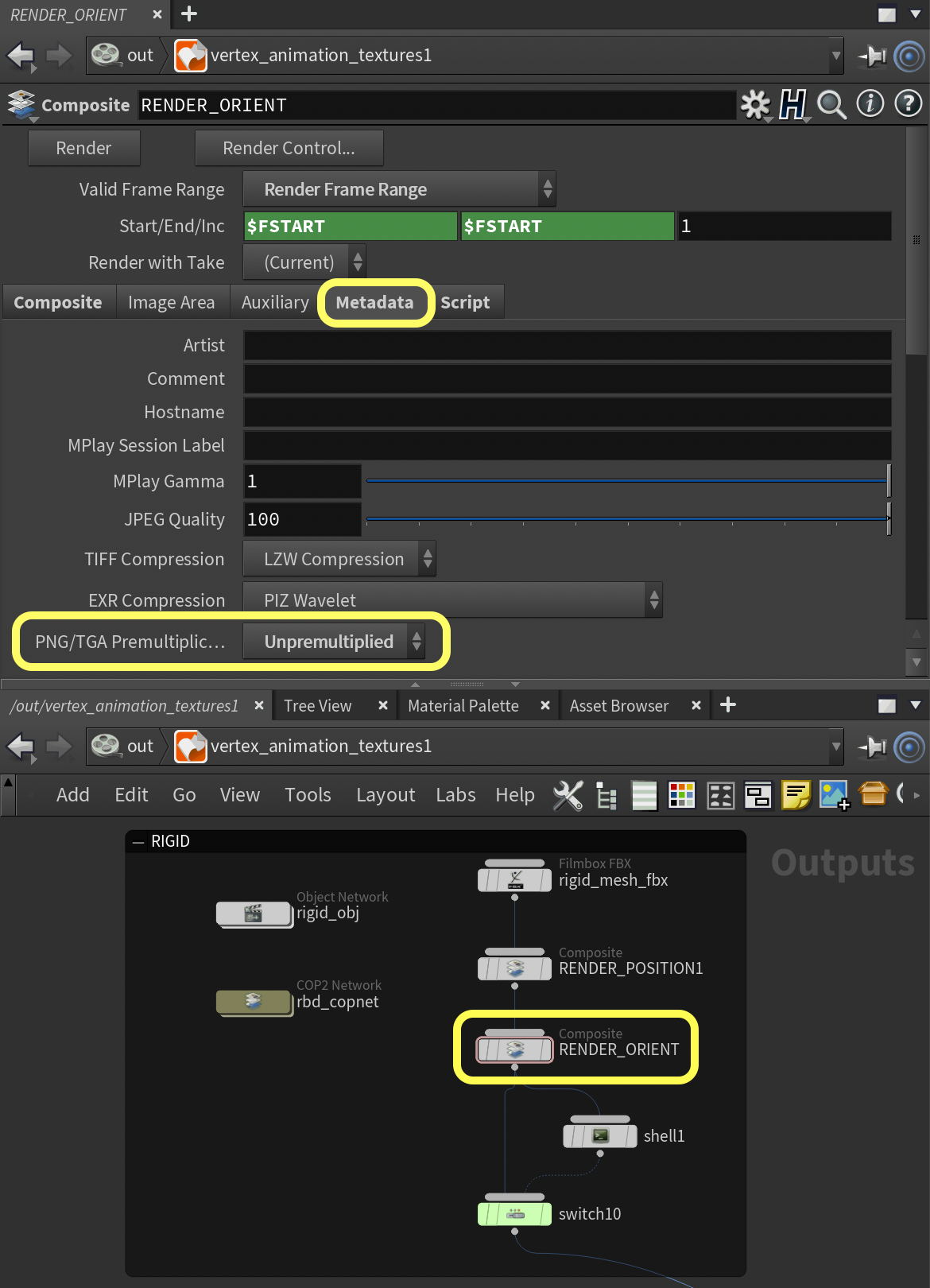 3. Double-click on the Labs Vertex Animation Textures (VAT) node to dive into the network. 4. Find the Rigidbody group and select the RENDER_ORIENTnode. 5. On theRENDER_ORIENTnode’s parameters, go to theMetadatatab, and change thePNG/TGA Premultiplicationparameter toUnpremultiplied.