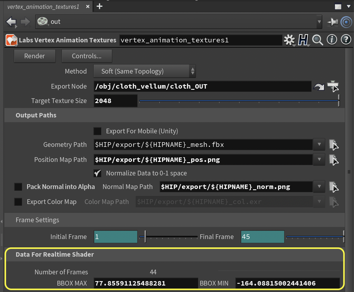 After you have your simulation ready and older versions of the Labs Vertex Animation Textures (VAT) output node available in Houdini, we can export the simulation.