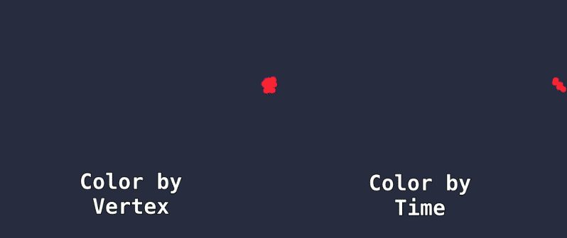 The “Color by Time” simulation (right) uses the V coordinate to control the color over the animation’s time. The V coordinate is a normalized 0-1 value indicating the current place within the animation (current animation frame / Number of Frames).
