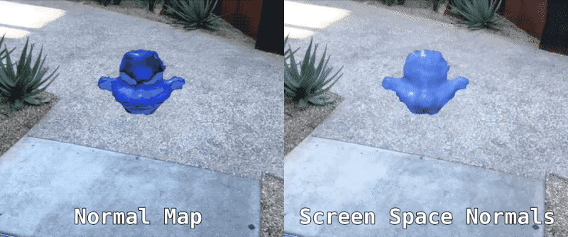 (Softbody and Fluid only) Use Screen Space Normals instead of Normal Maps. Normal maps often have a large memory footprint in Fluid and Softbody simulations. Using Screen Space Normals instead of the Normal Map texture allows you to reduce the total size of your Lens. However, this can also sometimes reduce visual quality. See the Screen Space Normals Generation guide as well as the Fluid Screen Space Normals example in the Vertex Animation Textures asset to see implementation of this technique.