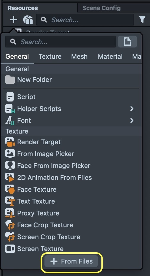In the Resources panel, select + -> Import Files.